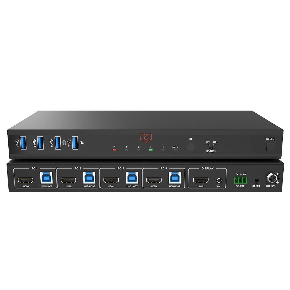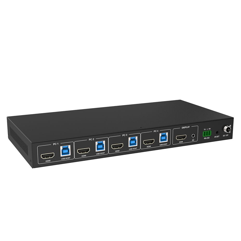 This is a 4x1 KVM Switcher with hotkey switching. It supports resolutions up to 4K@60Hz 4:4:4 8bit and can transmit USB 3.0 signal up to 5Gbps for KVM function.