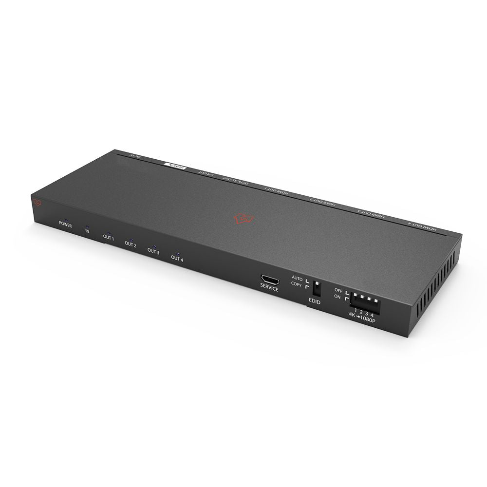 The 1x4 HDMI 2.0 Splitter simultaneously routes one HDMI source to four HDMI displays. Supporting resolutions up to 4K2K@60Hz (4:4:4) and HDCP 2.2. This product supports audio extraction from HDMI source to optical and analog output(s) by selecting COPY, AUTO modes EDID settings. Output(s) supports bypass and downscale(4K->1080P) functions.