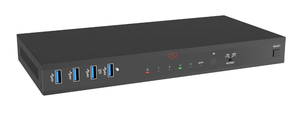 This is a 4x1 KVM Switcher with hotkey switching. It supports resolutions up to 4K@60Hz 4:4:4 8bit and can transmit USB 3.0 signal up to 5Gbps for KVM function.