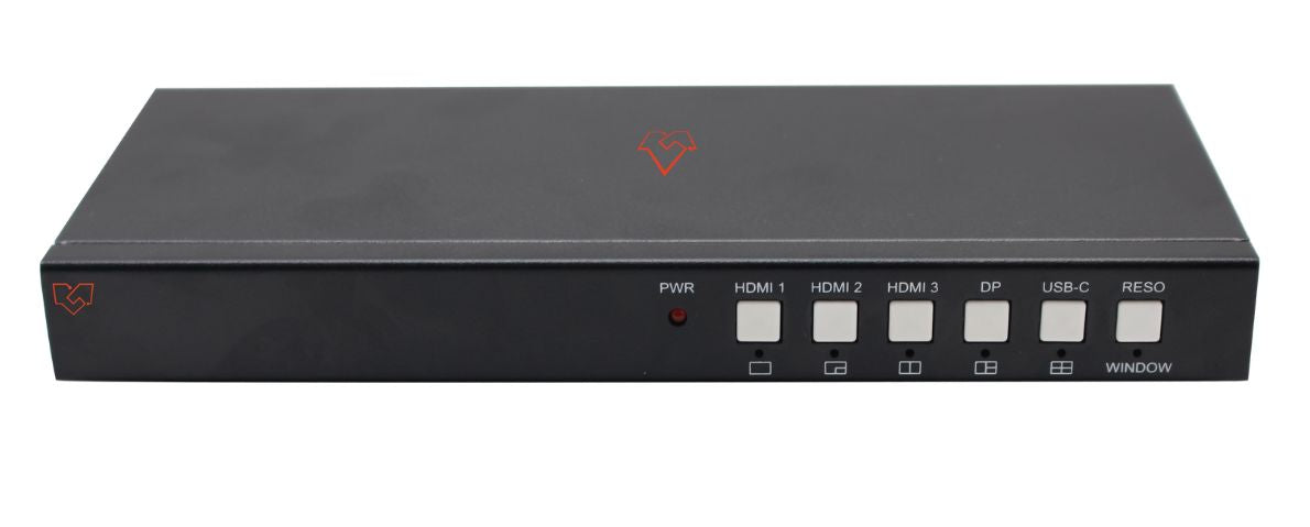 The 5x2 Seamless Presentation Switcher provides 3×HDMI, 1×DP, and 1×USB-C (video only) inputs, 1×HDMI and 1×HDBaseT mirrored outputs with PIP/PAP/Tri/Quad-view Multiview functionality. It supports single-screen seamless switching with no freezing, black, or snow screen. One 3.5mm audio de-embedding jacket can output analog stereo audio. Use Front Buttons or RS232 commands to control the switcher.