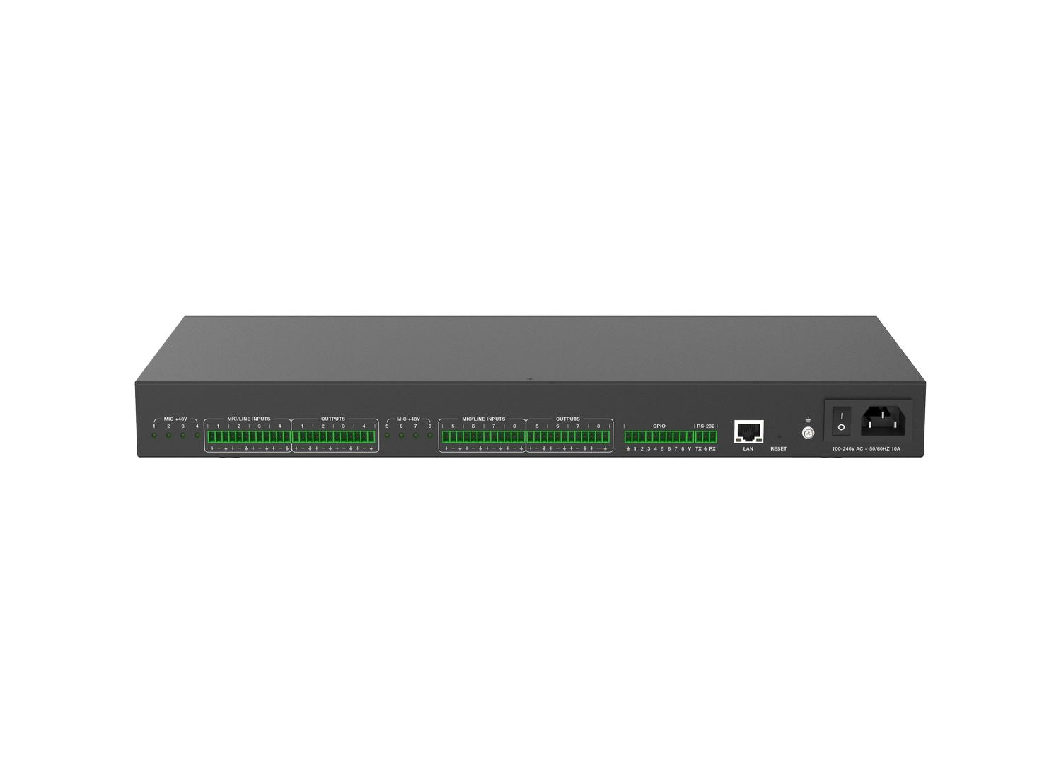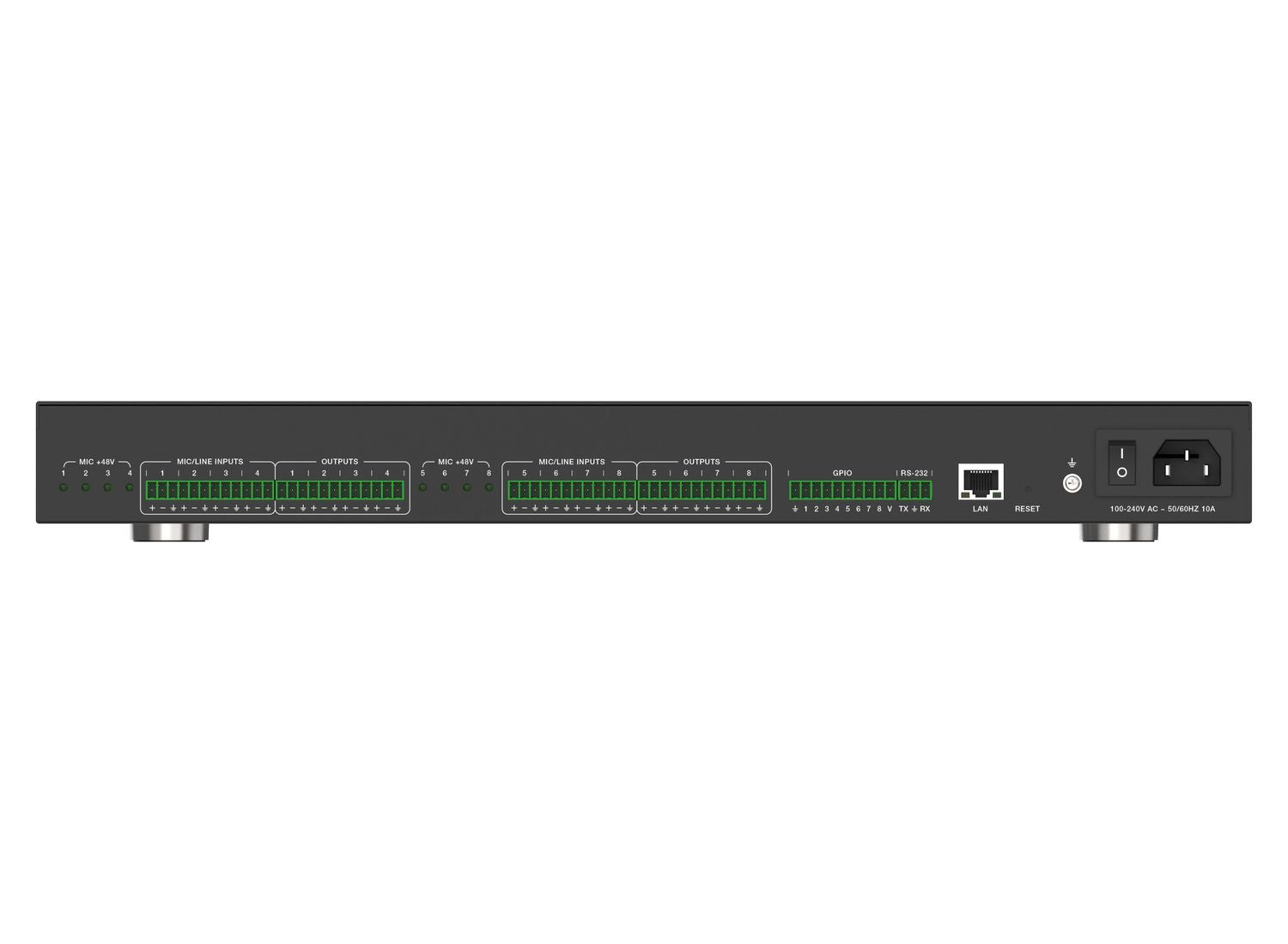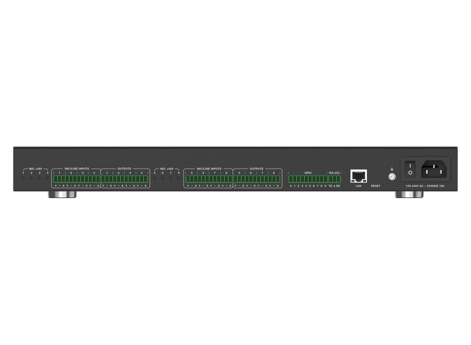 | Inputs | 8 × Balanced MIC/LINE [3-pin phoenix connector] or 4 × Stereo Audio [3-pin phoenix connector] |