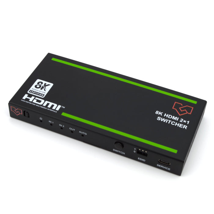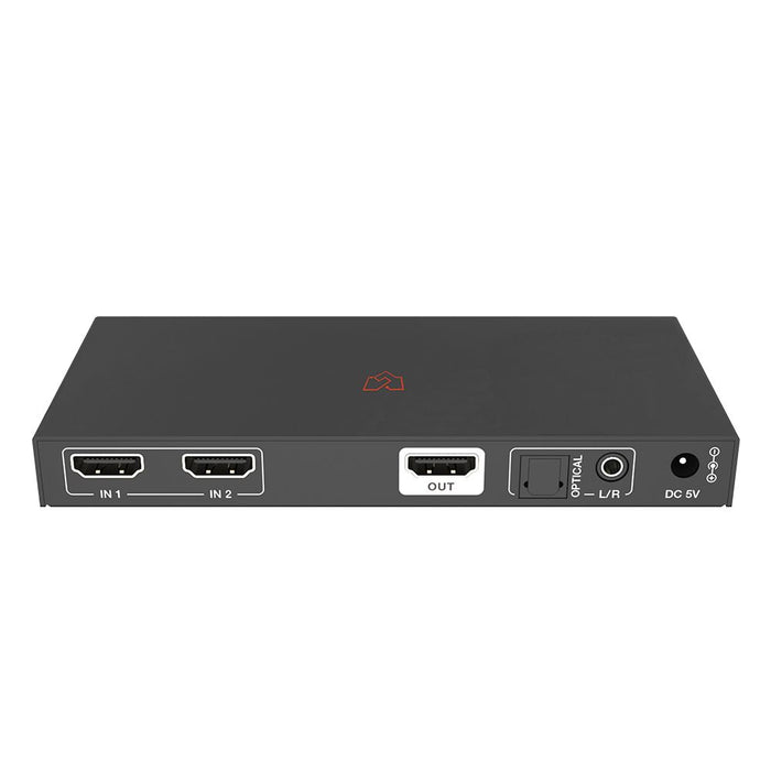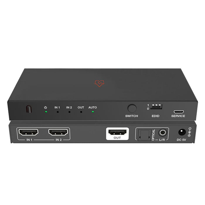This 8K HDMI 2x1 Switcher can switch any of the two HDMI source signals to one HDMI display. It supports video resolution up to 8K@60Hz 4:2:0. It supports advanced EDID management and audio de-embedding function (output through the optical and analog port). This multi-functional product can be widely applied in scenarios of demonstration, video conference, multimedia teaching and other occasions requiring for big-screen demonstration.