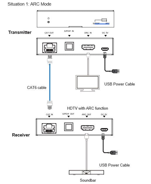 | Receiver | Inputs: 1×CAT [RJ45, female] 1 x Micro-USB Outputs: 1 x S/PDIF OUT [Optical Audio Jack] 1 x ARC OUT [HDMI Type A, 19-pin female] |
