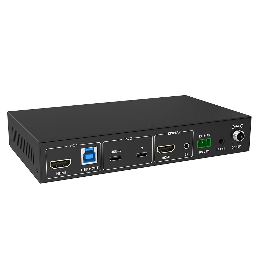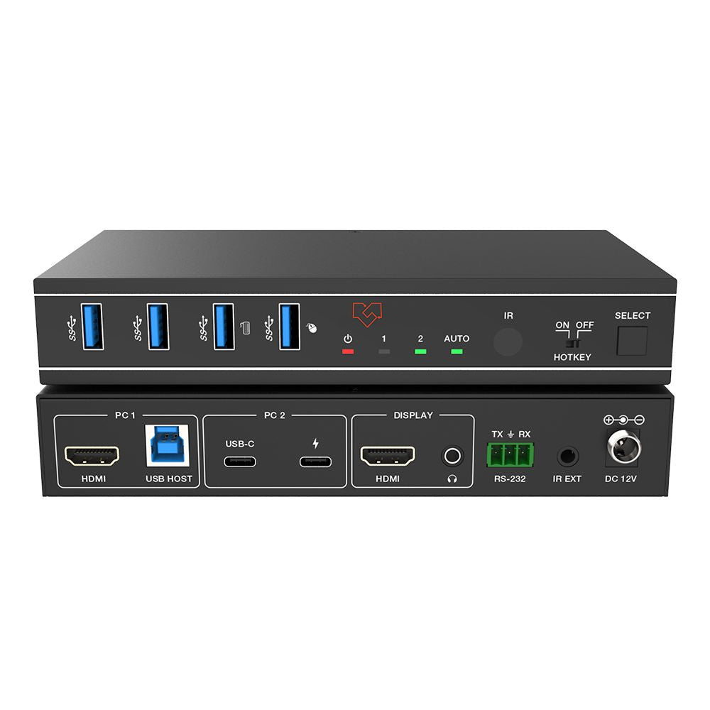Input supports 1x HDMI port and 1x USB-C port with a USB-C charging port that can supply power to the USB-C device. The switcher features a virtual interaction function to automatically wake up the connected PC in standby mode, which can reduce the switching time. It also supports direct switching through buttons on the front panel, IR remote, and hotkey through keyboard/mouse connected to the unique USB port. It provides a wide compatibility choice for different operating systems, such as Windows, Mac OS, and Linux, with no driver required, and simple plug-and-play.