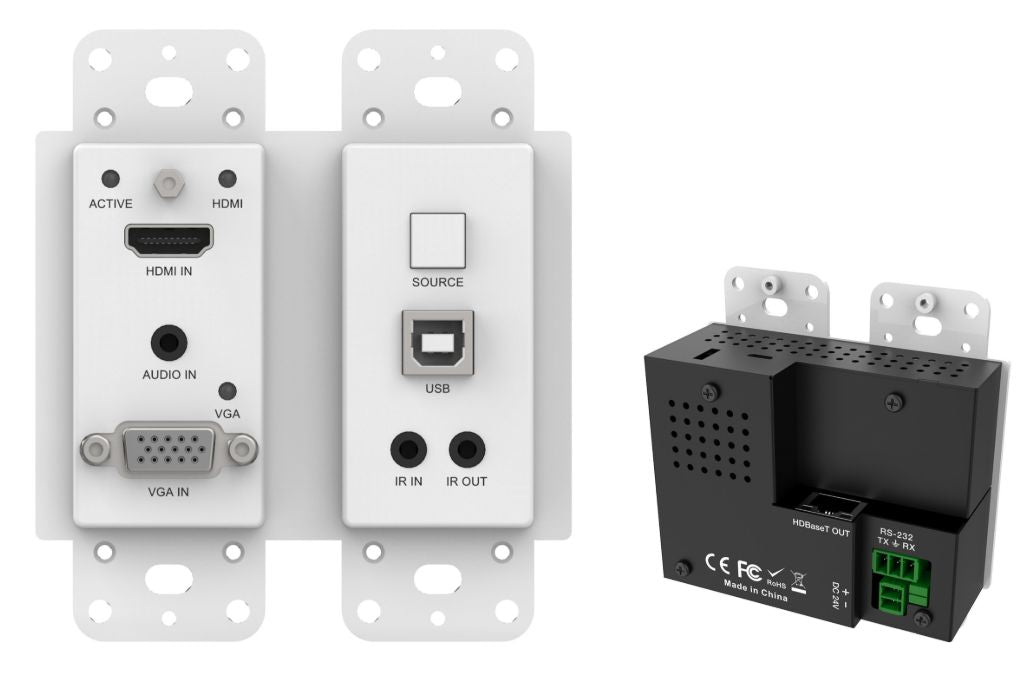 The HDBaseT Wall-plate Transmitter supports HDMI and VGA with audio inputs within a standard 2-Gang US Decora wall box. It can transmit HDMI signal over CAT6/6a/7 to the distance up to 131ft/40m for 4K2K@60Hz (4:4:4) or 1080p60Hz up to 230ft/70m. Auto-switching allows user to plug-in and play. Built-in two-way IR, RS-232, and USB transmissions for easy device control.